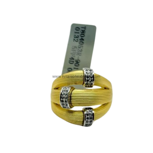 Son corps finement texturé en alliage doré satiné évoque les lignes fluides de la nature, tandis que ses trois anneaux entrelacés sont sublimés par des incrustations scintillantes de cristaux.