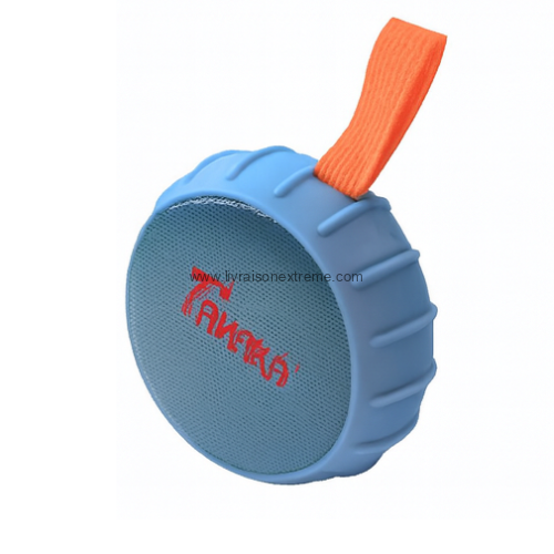- Design : Haut‑parleur circulaire robuste avec sangle orange pour transport facile. Disponible en plusieurs coloris (vert, bleu).