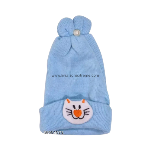 - Design : Chaque bonnet est orné d’un motif de visage de chat stylisé sur le devant et d’un petit nœud ou pompon sur le dessus.