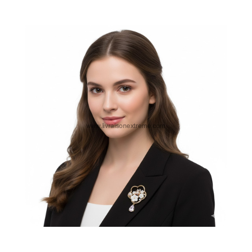 - Éléments décoratifs : Elle comporte également deux perles rondes et plusieurs petits cristaux qui ajoutent de l’éclat.