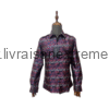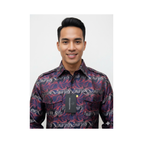 Cette chemise à manches longues impose un style assumé : motif baroque/cachemire en rouge profond et arabesques argentées sur une base noir/bleu nuit à légère brillance satinée. Col classique, pattes d’épaule et deux poches poitrine à rabat : des détails soignés pour une allure statutaire.
