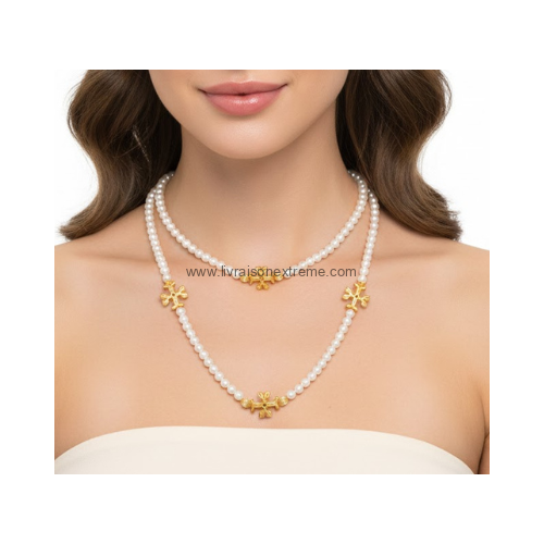 - Détails des ornements : Plusieurs ornements dorés, en forme de croix à quatre feuilles (souvent associée au logo de la marque Tory Burch), sont espacés le long de la chaîne de perles.