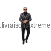 - Pantalon : Le pantalon est noir uni, sans motif, et de coupe classique.