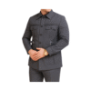 Le costume présenté est un ensemble de couleur anthracite ou gris foncé, de style safari ou militaire, caractérisé par plusieurs détails distinctifs: