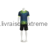 - Le maillot est de couleur bleu marine avec des motifs graphiques dégradés en vert fluo sur le devant et les manches.