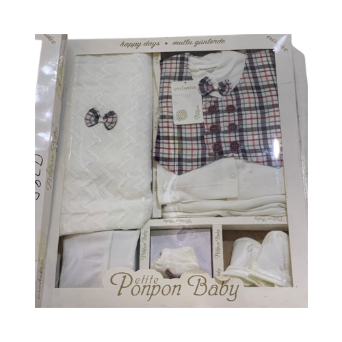 C’est un ensemble formel de 5 pièces pour bébé nouveau-nés, présenté dans une boîte cadeau.