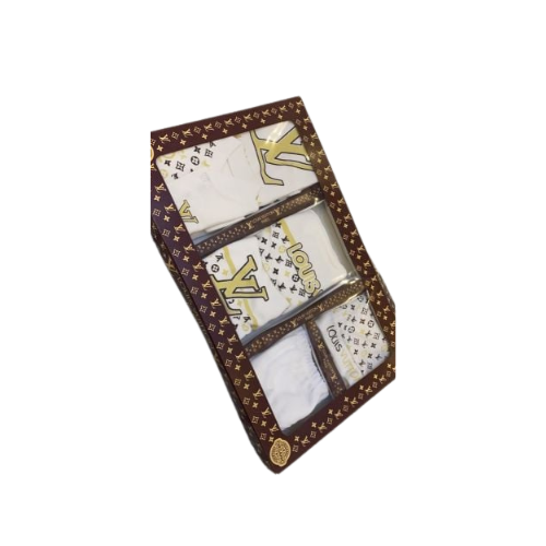 - Contenu du coffret : Le coffret contient un ensemble de bodys ou de hauts à manches longues et de bas assortis, ainsi que des chaussettes ou chaussons, tous ornés du motif Monogramme emblématique de Louis Vuitton et/ou des LV Initiales.