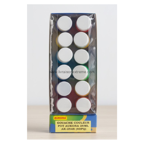 Il s’agit d’un ensemble de gouache de la marque Aukora, conditionné dans des pots de 25 ml. Le kit contient 12 couleurs différentes et un pinceau, ce qui est idéal pour les projets artistiques et scolaires.