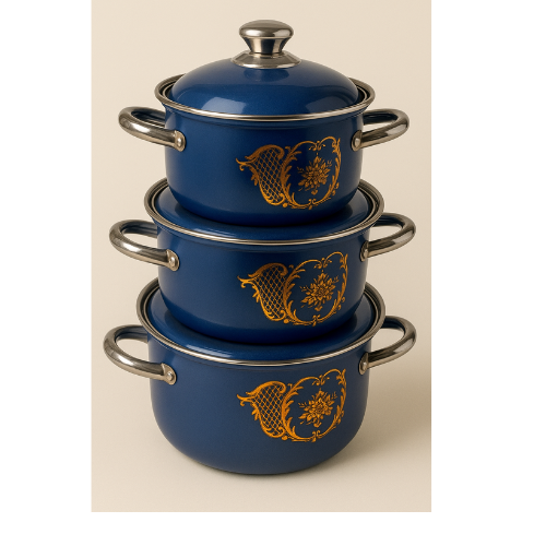 - Design élégant et décoratif : Le set de casseroles « Prestige » est une collection unique qui allie utilité et esthétisme. Leur finition en émail bleu profond est rehaussée d’un motif floral doré délicat, ce qui les rend aussi belles sur la table qu’elles sont fonctionnelles en cuisine.