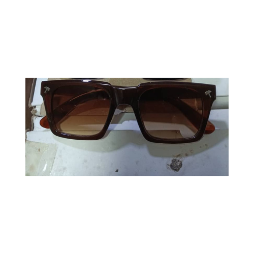 Les lunettes présentées sont des montures de style carré, avec des branches épaisses. Elles se déclinent en plusieurs versions, incluant des lunettes de soleil avec des verres teintés (marron) et une paire de lunettes de vue avec des verres transparents.