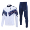 Plongez dans l’histoire du football italien avec ce survêtement d’entraînement de l’équipe nationale. La veste, d’un blanc éclatant, est rehaussée par un motif graphique en zigzag bleu marine et rose, qui évoque les designs emblématiques de l’époque. Les logos de la marque Diadora et du blason de l’Italie sont présents sur la poitrine, pour un look authentique.