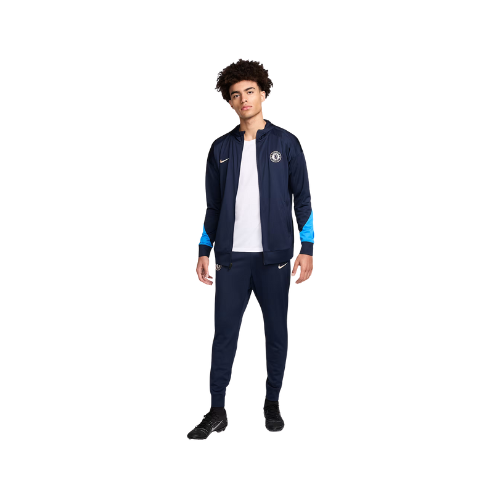 - Veste : De couleur bleu marine, elle présente le logo Nike et l’écusson du Chelsea FC sur la poitrine. Des empiècements bleu clair sont visibles sur les avant-bras.