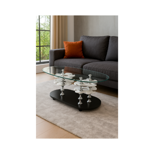 Plateau supérieur : Verre trempé transparent, de forme ovale aux bords arrondis, élégant et sécurisé.
