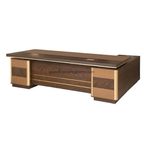 Style exécutif moderne, finition bois foncé avec détails dorés élégants. Surface large et panneaux robustes, parfaits pour un bureau professionnel.