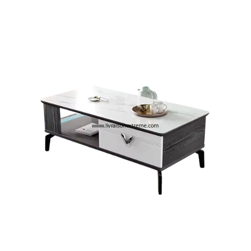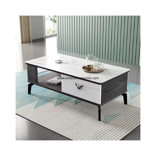 - Caractéristiques visuelles : La table basse présente un plateau blanc marbré et une base combinant des sections noires et blanches avec un tiroir.